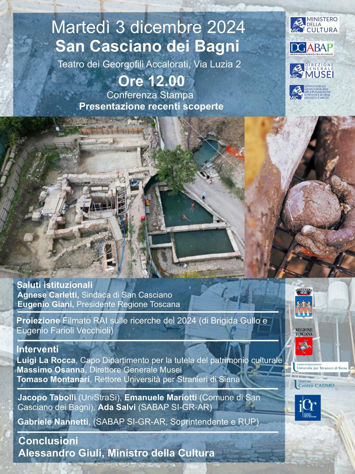 San Casciano dei Bagni (SI), Teatro dei Georgofili Accalorati, in via Luzia 2 - conferenza stampa di presentazione delle recenti scoperte avvenute all’interno del “Santuario Ritrovato”