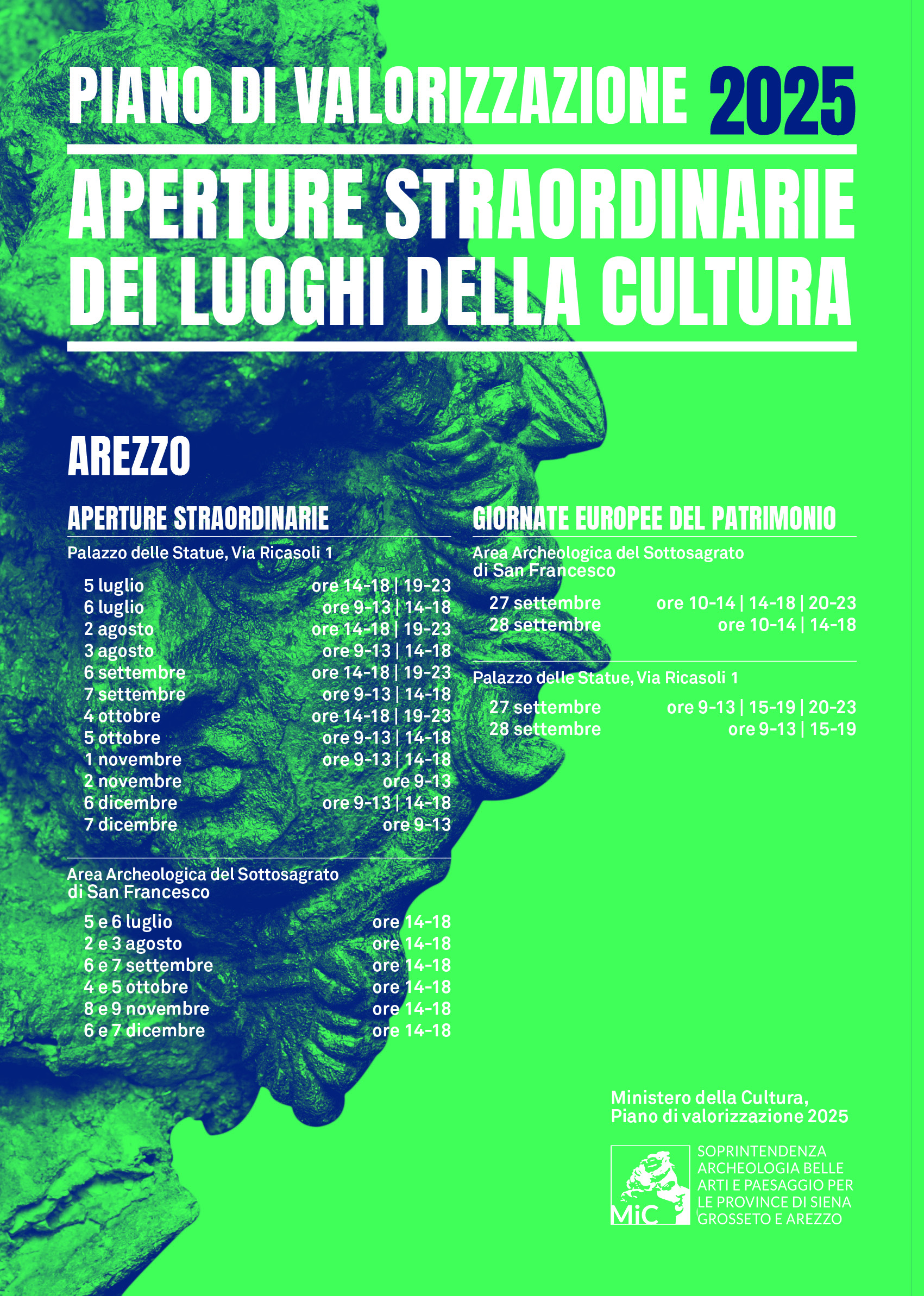 Anche per il 2025 la Soprintendenza Archeologia, Belle Arti e Paesaggio per le province di Siena, Grosseto e Arezzo rinnova la partecipazione al “Piano di valorizzazione” promosso dal Ministero della Cultura, offrendo un ricco calendario di aperture straordinarie e gratuite che coinvolgeranno alcuni dei luoghi più suggestivi e meno conosciuti del patrimonio culturale toscano.