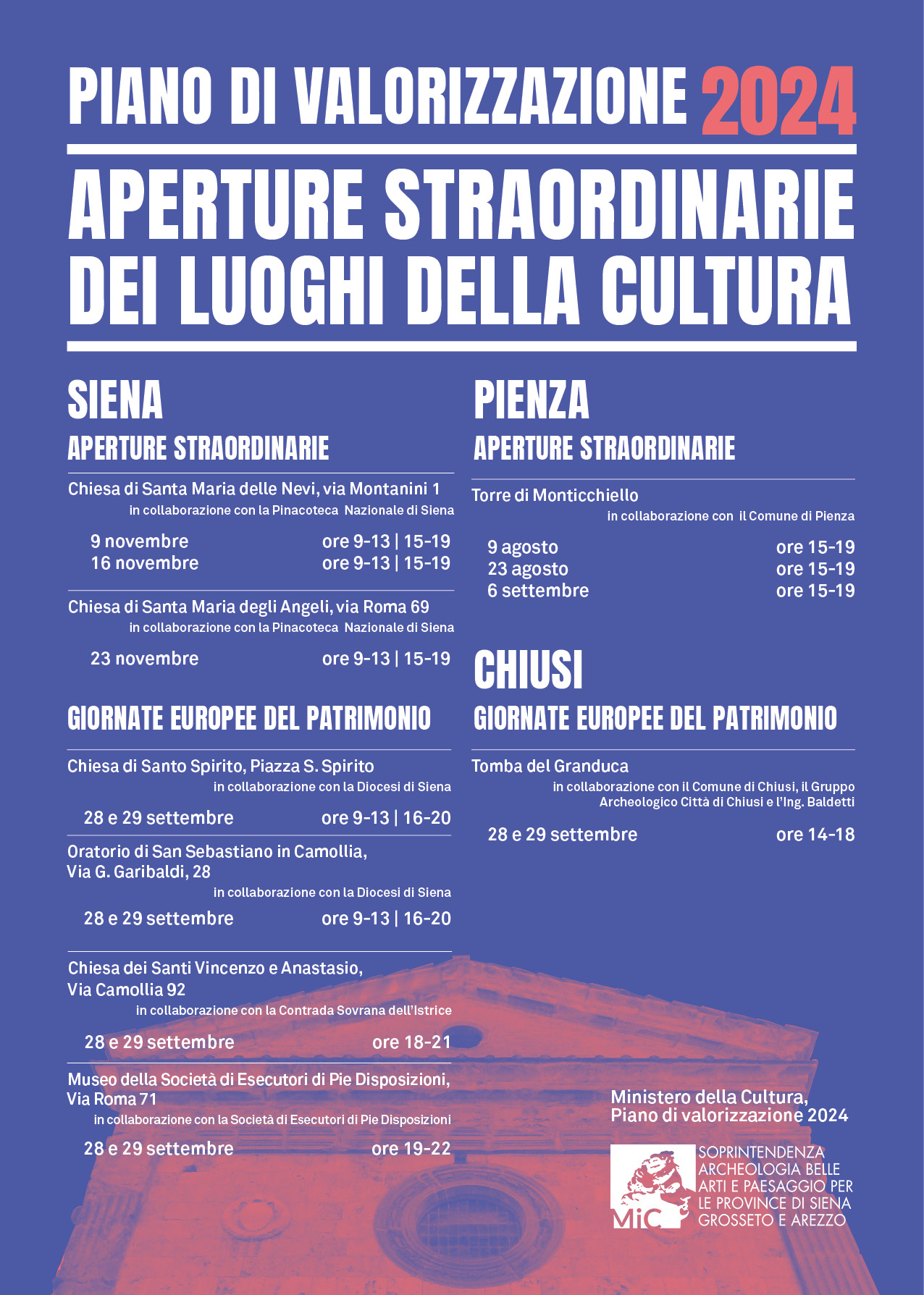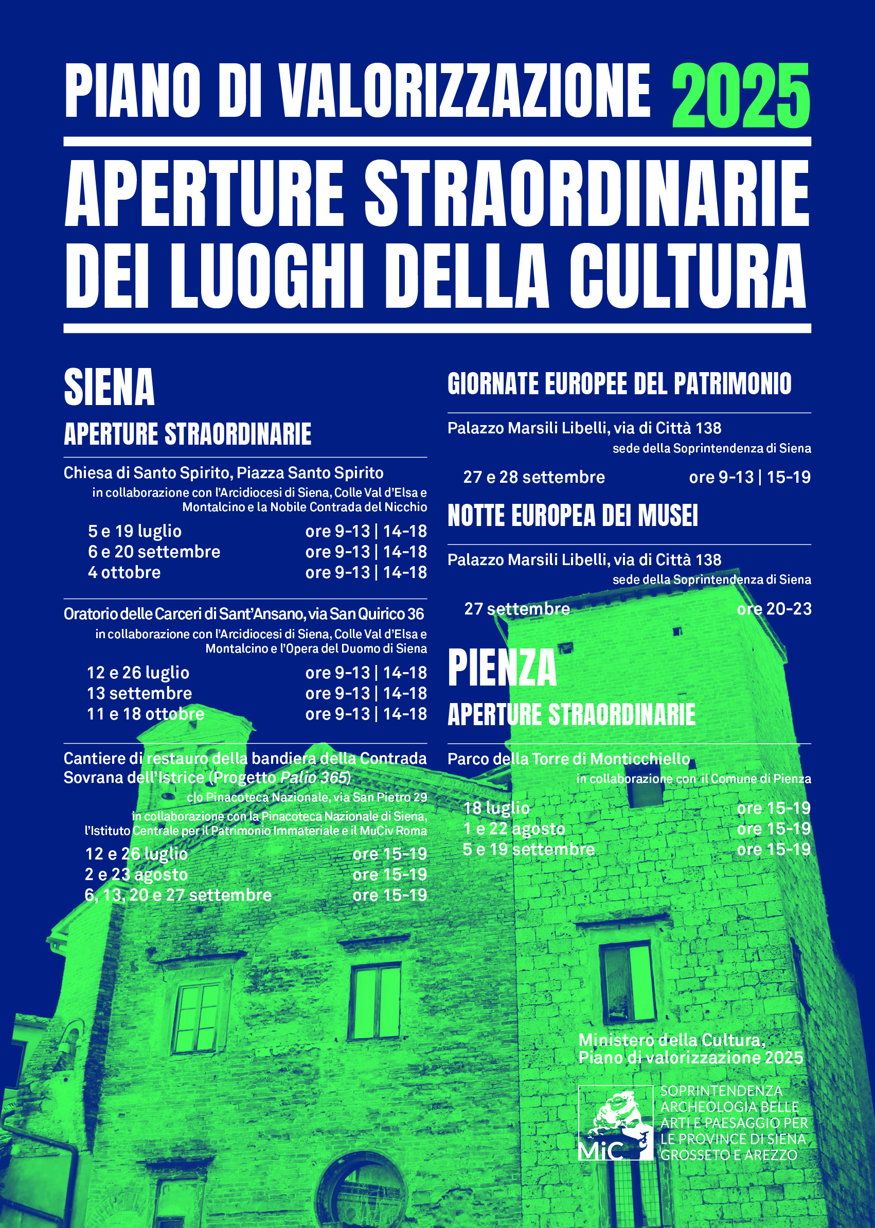 Tra gli appuntamenti più attesi si segnalano le aperture dell’Oratorio delle Carceri di Sant’Ansano in collaborazione con l’Opera della Metropolitana di Siena e l’Arcidiocesi di Siena, Colle di Val d’Elsa e Montalcino e della chiesa di Santo Spirito in collaborazione con l’Arcidiocesi di Siena, Colle di Val d’Elsa e Montalcino e la Nobile Contrada del Nicchio.